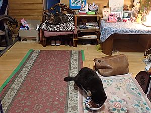カウ君はデモンストレーション。みんな無視。元祖黒トラは室内で先に食べる。