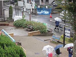今日は新聞休刊日。ゴミ出しをする。傘をさした子供達が集団登校で集まってくる。