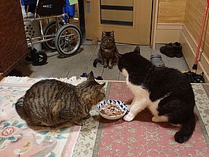 ガチャミケだけ定位置で食べている。今日は黒トラ1号も食べている。