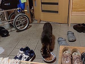 戻ってくると薄暗くなっていた。2時間竜と猫もまた食べる。マルハチ君がカリカリを食べた。