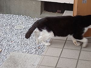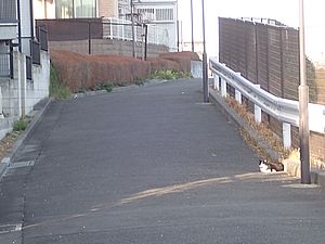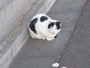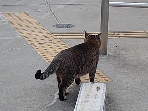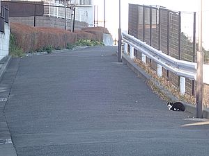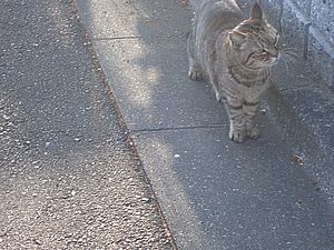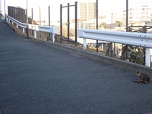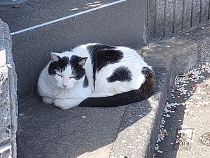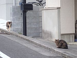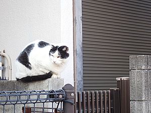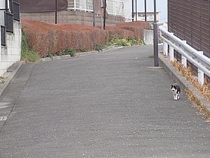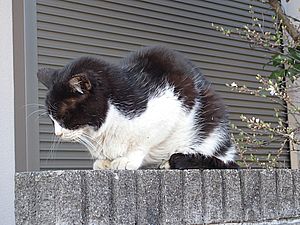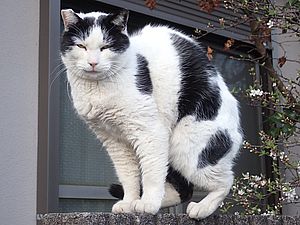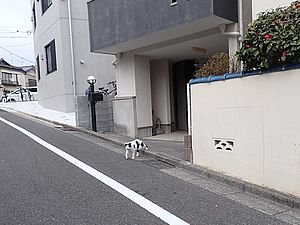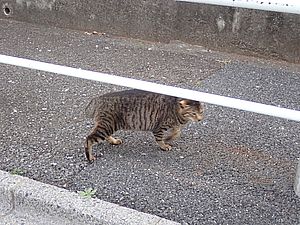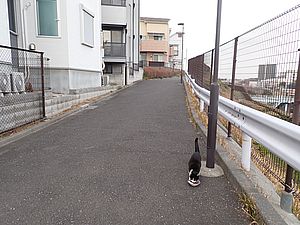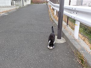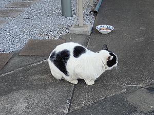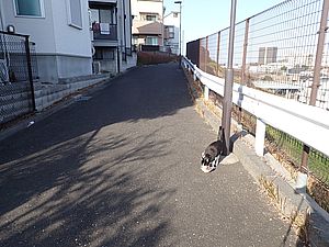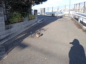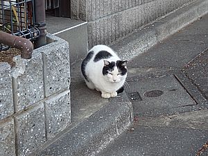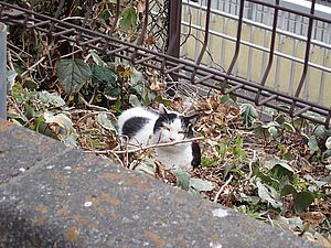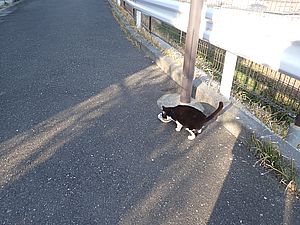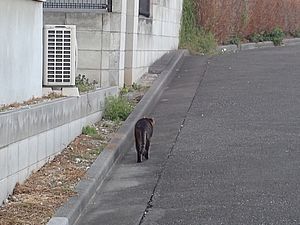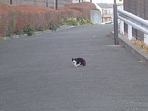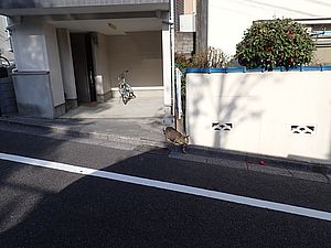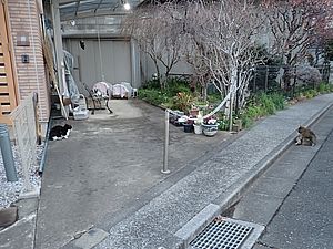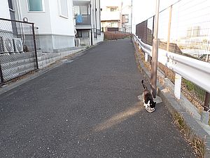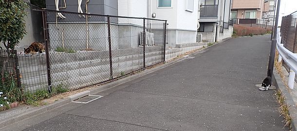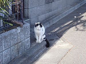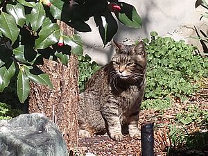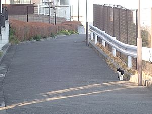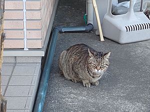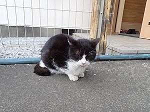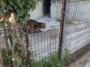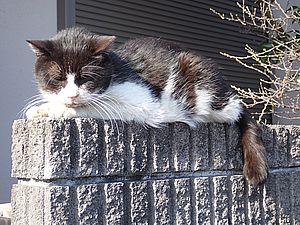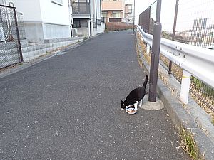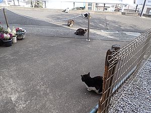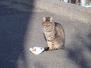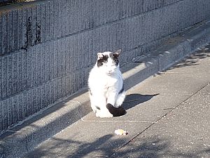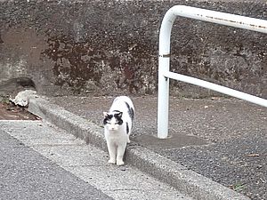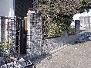 支援物資をもってばあちゃんと猫の様子を見に行く。お気に入りの塀の上にマルハチ君がいた。