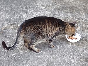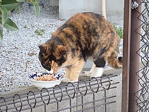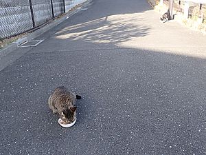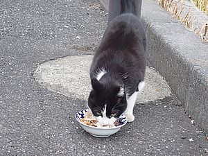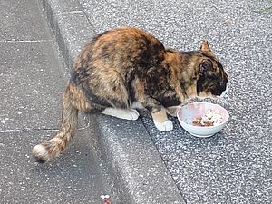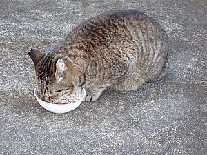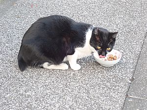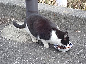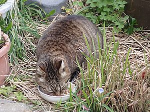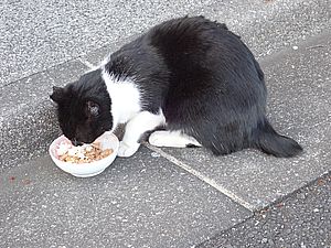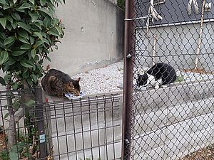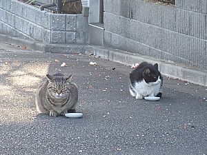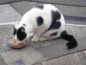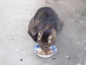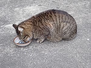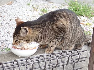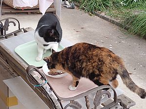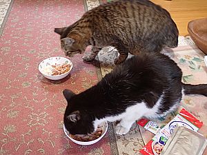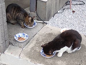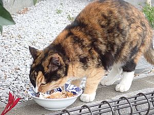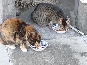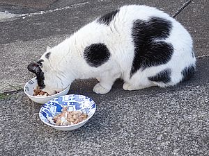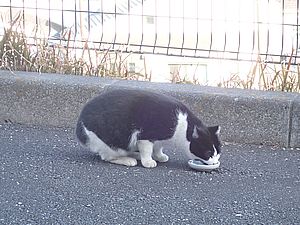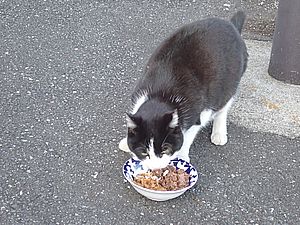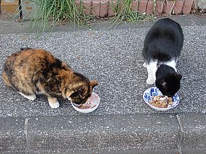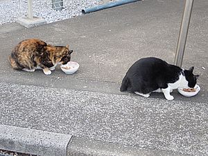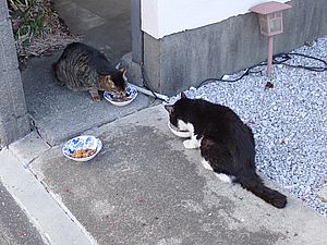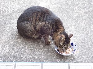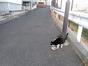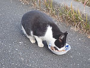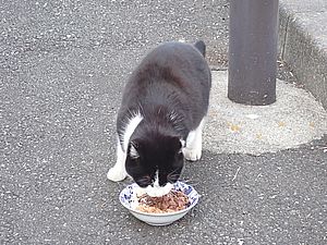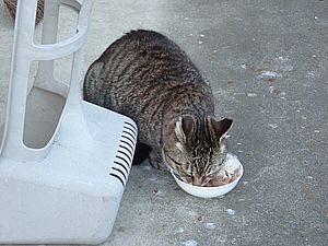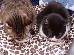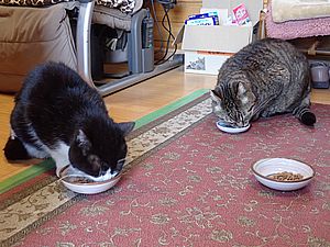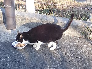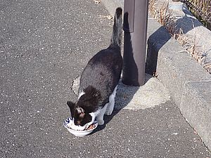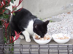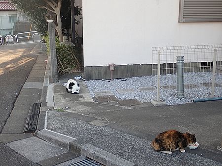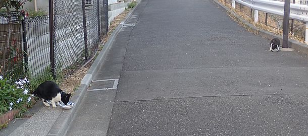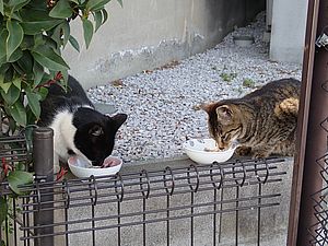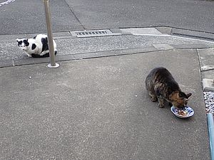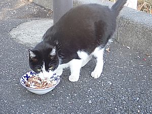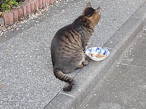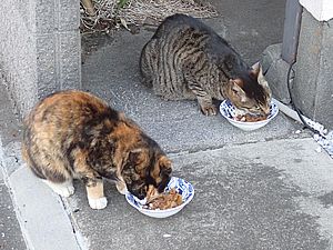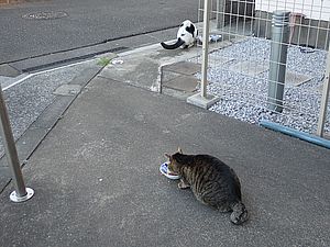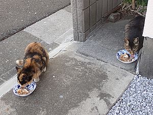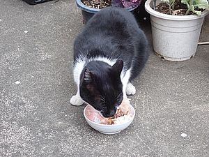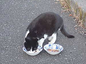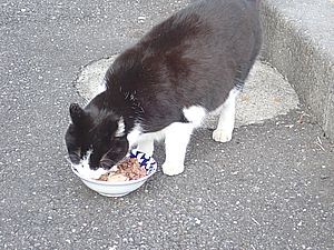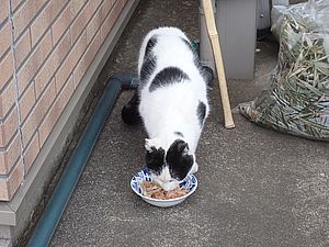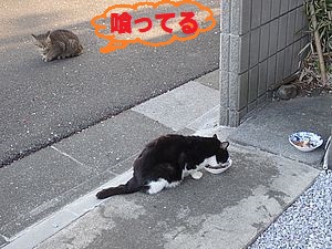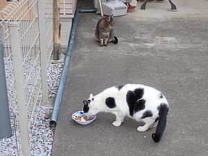 黒トラ1号とマルハチ君は他の猫のエサを食べている。他猫のエサはうまい。