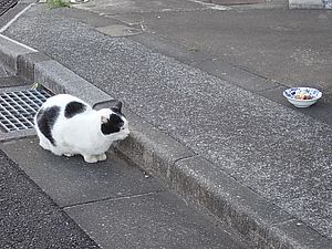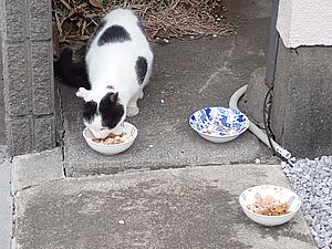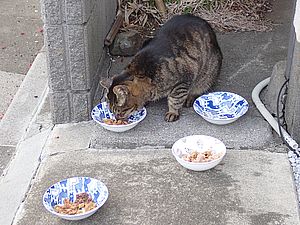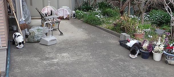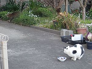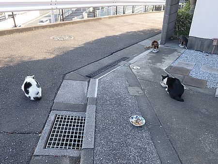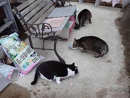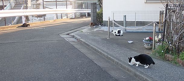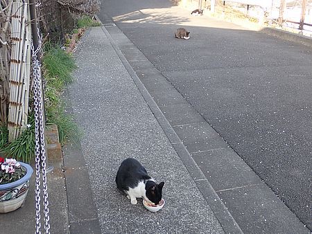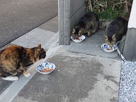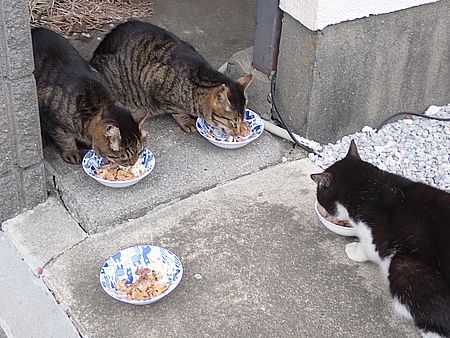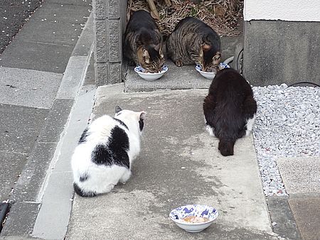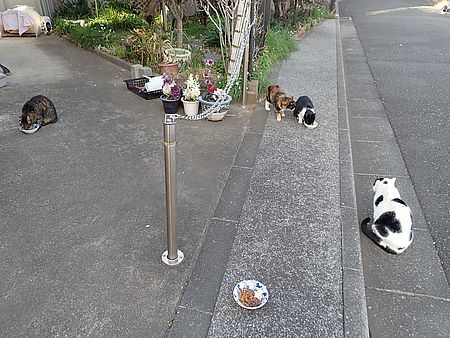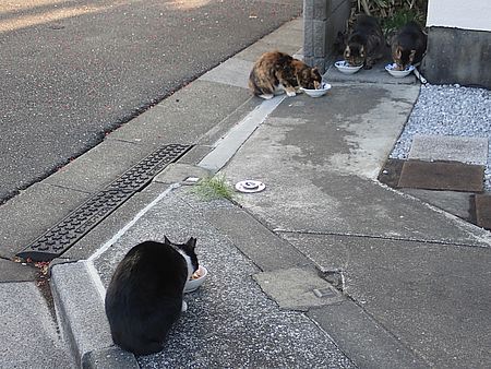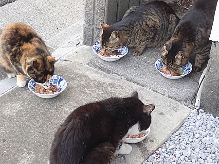 玄関前では指定席で4匹が食べる。カウ君は食べないで見ている。