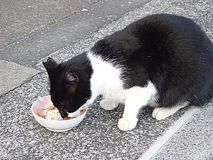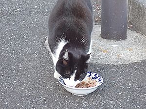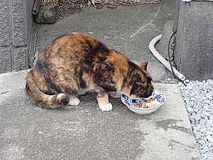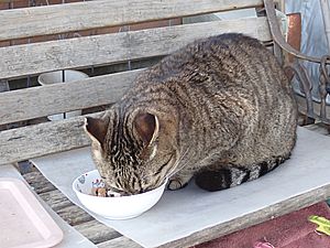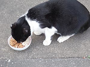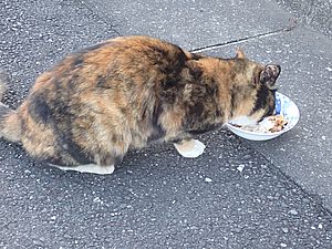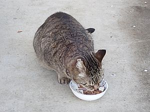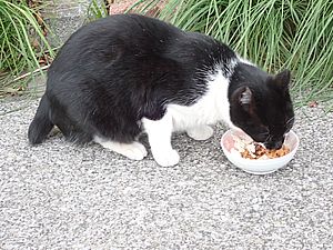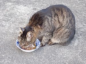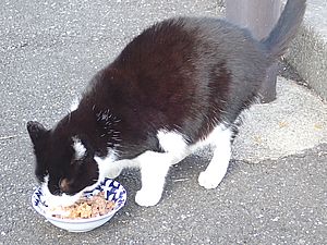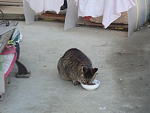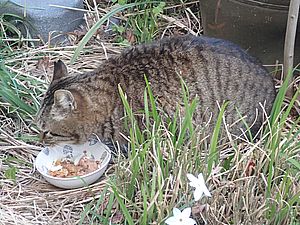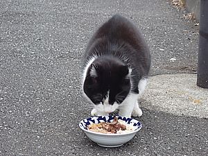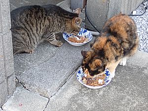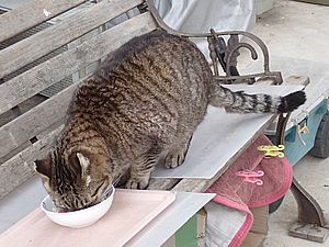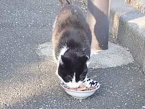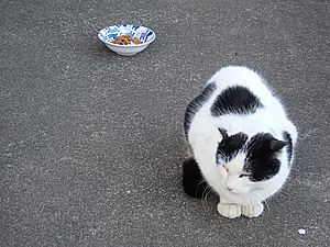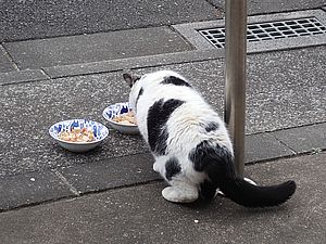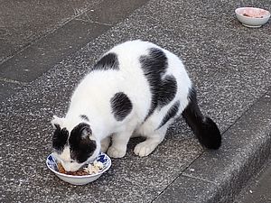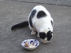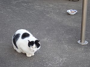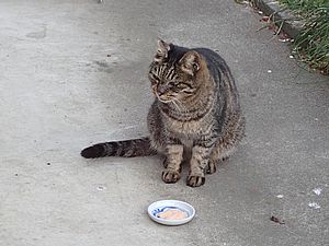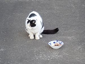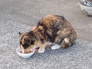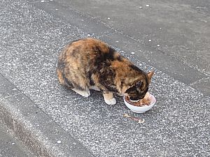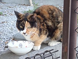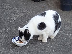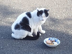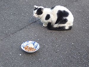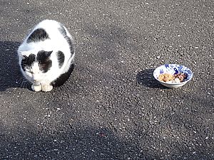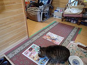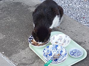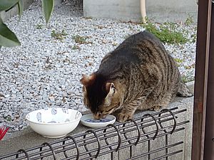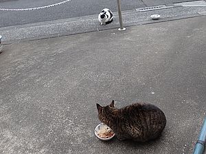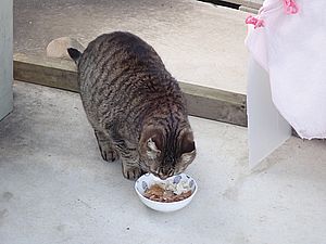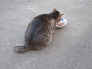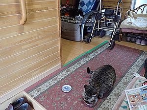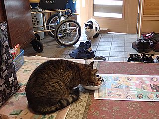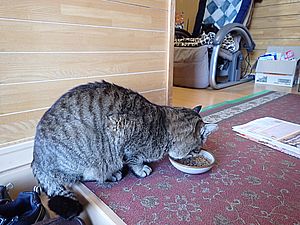 早めに食事タイム。人が多いので猫も警戒気味。