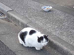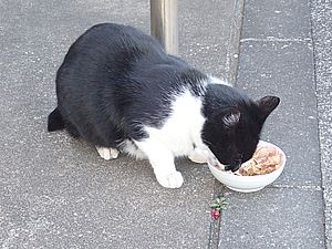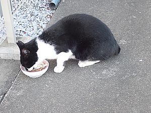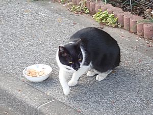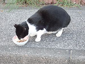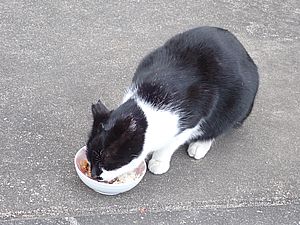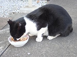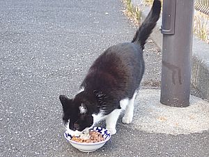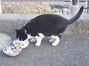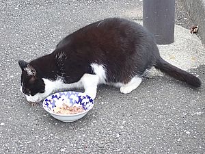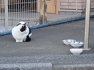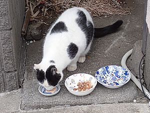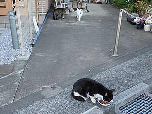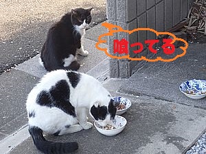 点呼のたびに少しずつ猫が増えてくる。あご黒は指定席で個食。
