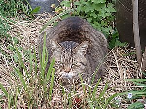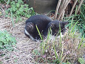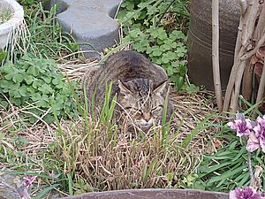 人気のススキベッドに黒トラ1号が寝ていた。今日もおき餌のカリカリが散乱している。やはり鳥の仕業だろう。