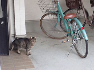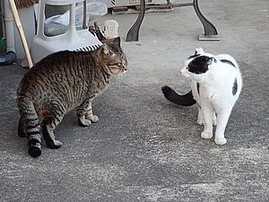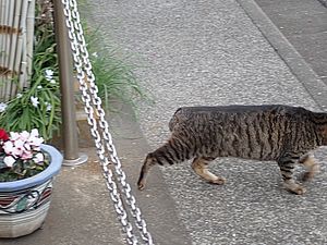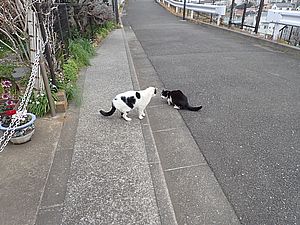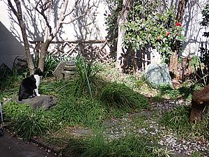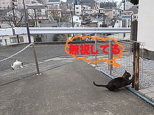 ファントム君が歩いていた。庭でファントム君と元祖黒トラが視線を合わせている。