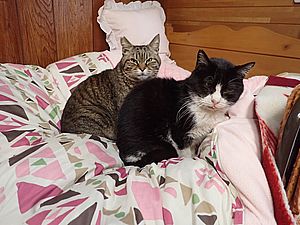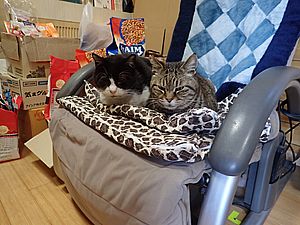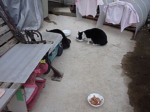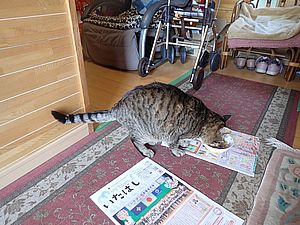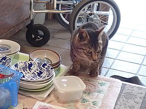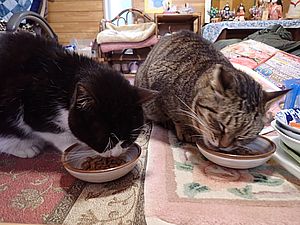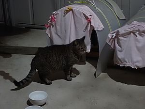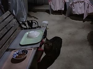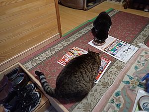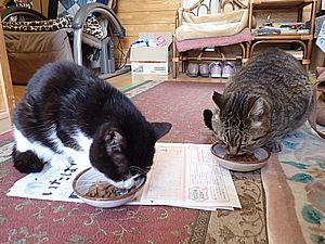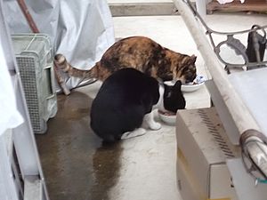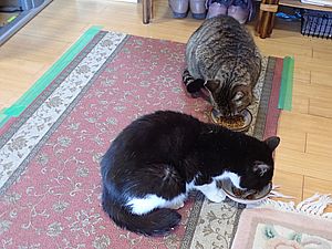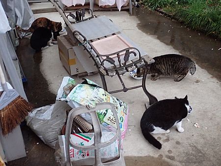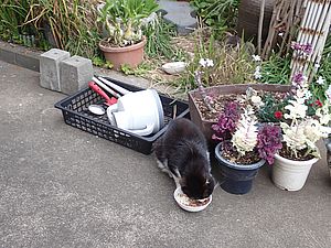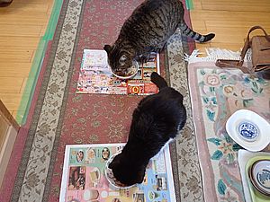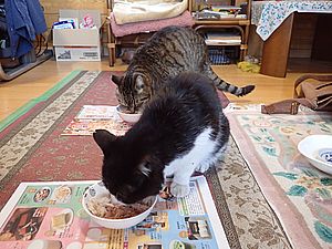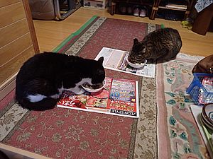 元祖黒トラとマルハチ君は超好評カリカリを食べる。黒トラ1号とファントム君が残務整理をしている。