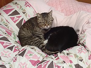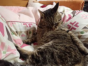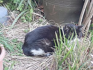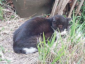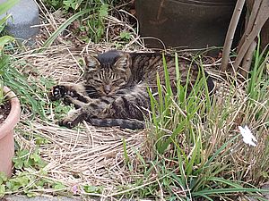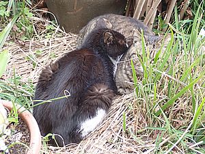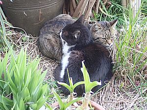 カウ君が伸びた。元祖黒トラとマルハチ君はくっついてススキベッドにいた。