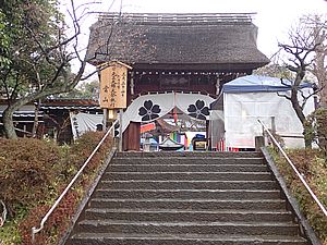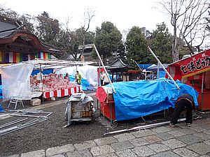 今年は山門のウメも咲き終わっている。まだ時刻は早く雨も降っているのでテントの組み立て中。