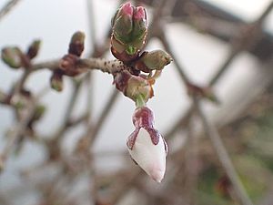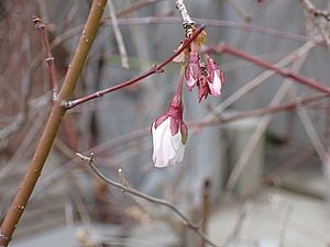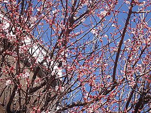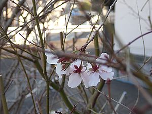 サクラのつぼみがだんだん膨らんできた。今開花しているのは最初の開いた二輪のみ。もうすぐ開花宣言のようだ。
