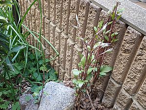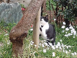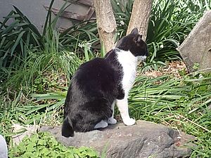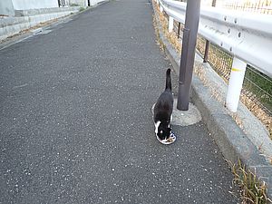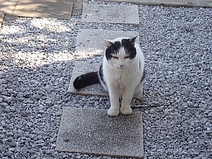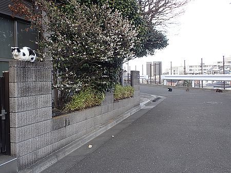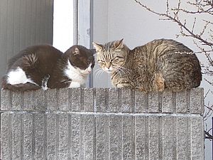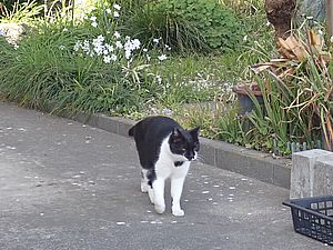 今日もばあちゃんと猫の様子を見に行く。カウ君が塀の上にいた。