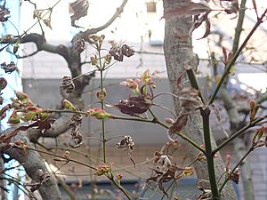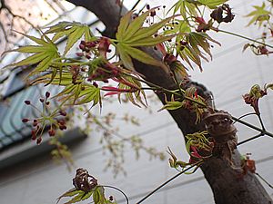 カエデが開花寸前になってきた。今年は新緑と枯葉が同時に枝にある。