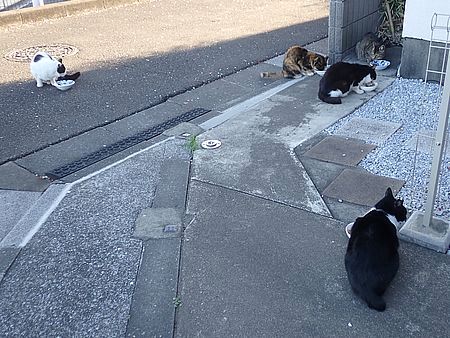玄関前には5匹。今日の黒トラ1号は汁だくの特別食を出したがほとんど食べずに離脱。