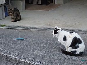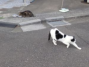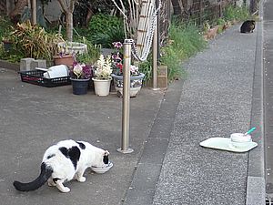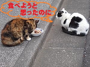 猫三角地帯でファントム君と黒トラ2号が残務整理をする。イヤイヤの2匹は相変わらず食べない。