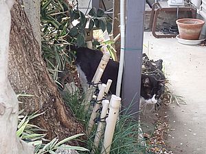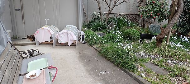 左の小屋の中にファントム君ともう1匹入っていた。マルハチ君が入っていった。元祖黒トラはのぞいただけでベンチ下の小屋の方に入っていった。