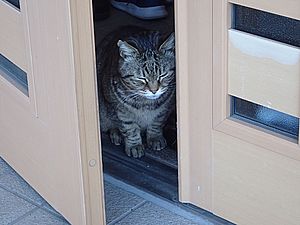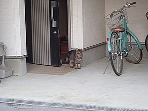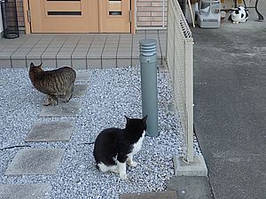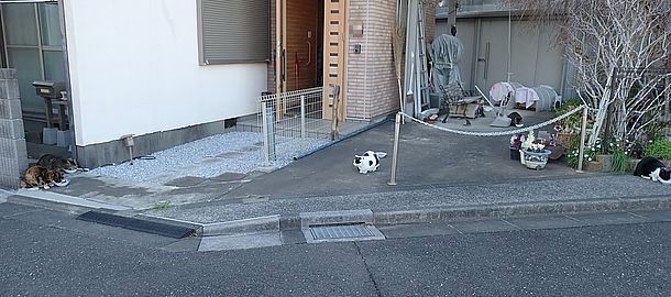 玄関前の指定席には黒トラ2号、ガチャミケとマルハチ君の3匹。