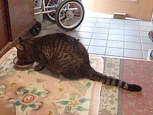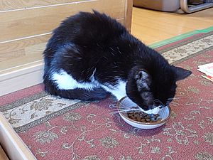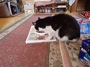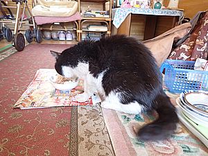 マルハチ君が室内で先に食べる。最近食べる量が少ない。