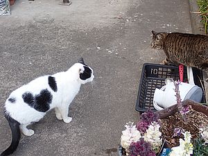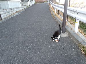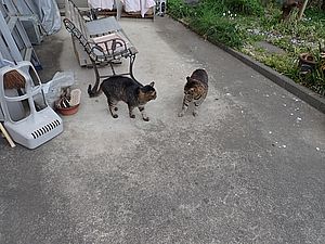 空き餌をマルハチ君が食べている。それを見ている黒トラ1号。元祖黒トラが黒トラ2号を鉢合わせした。帰りに夕食を食べていく。