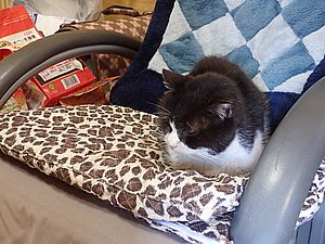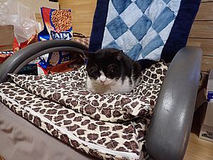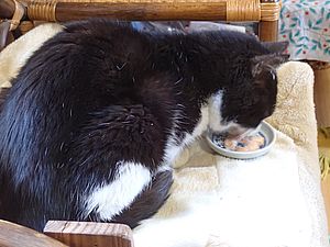 マルハチ君はお気に入りのイスで超好評カリカリとちゅーるを食べる。