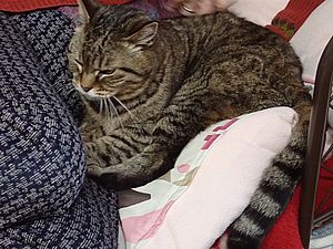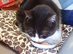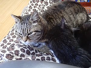 元祖黒トラが超好評カリカリを食べっていった。最後に残ったのは元祖黒トラとマルハチ君だけ。