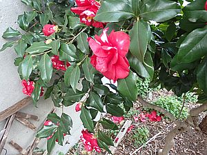 今日は猫君はいなかった。駐車場の隣にボケの花が咲いていた。