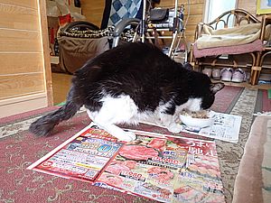 あご黒の残りをさらに食べる黒トラ2号。室内ではマルハチ君が超好評カリカリを食べた。