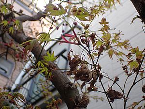 昨夜の雨の時は紅葉に戻っていた葉がまた枯葉になっていた。新葉と枯葉が混在している。